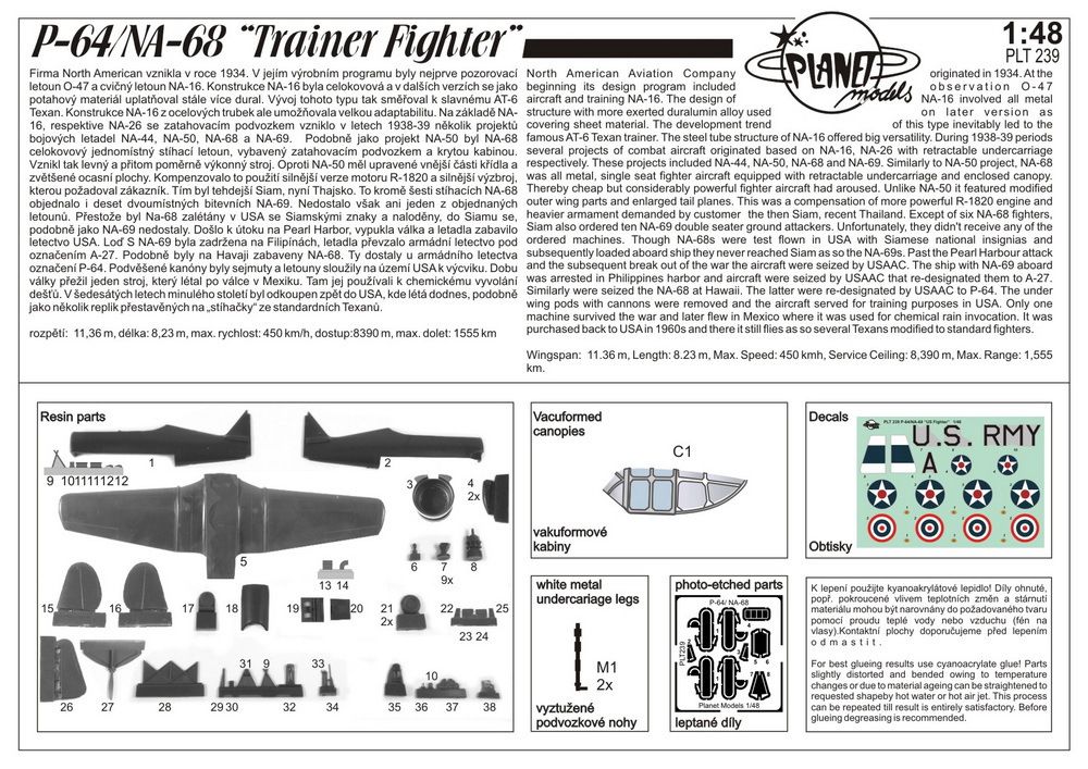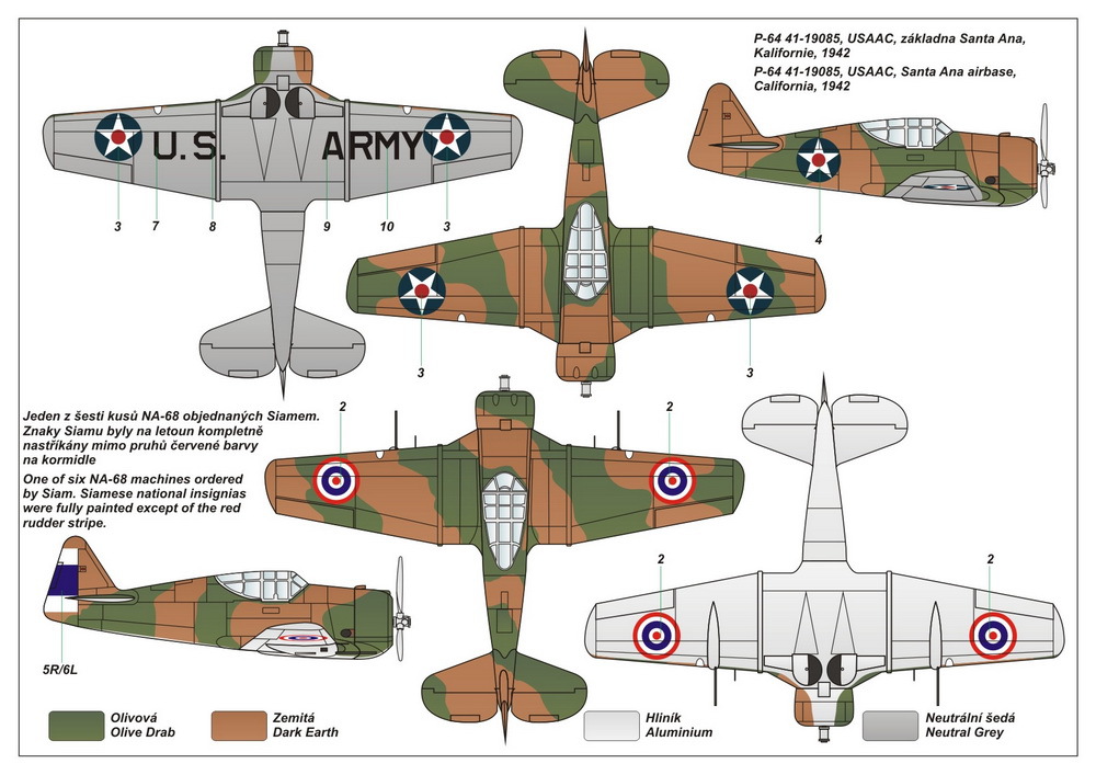 Full resin kit of a fighter aircraft ordered by Siam (Thailand) in November 1939. The order was ready for delivery at the end of 1941 but the aircraft already aboard the ships were never delivered. When USA entered WW II the fighters were seized by US Government and handed over to US Army Air Force. USAAF re-designated the aircraft to P-64 and used them for fighter pilots training. Only one machine is preserved. After the war it was used in Mexico, and then returned to USA where it flies as warbird to the present days. The kit contains resin parts, photo-etched parts, vacu-formed canopy and decals for one Siamese and one USAAF machines.