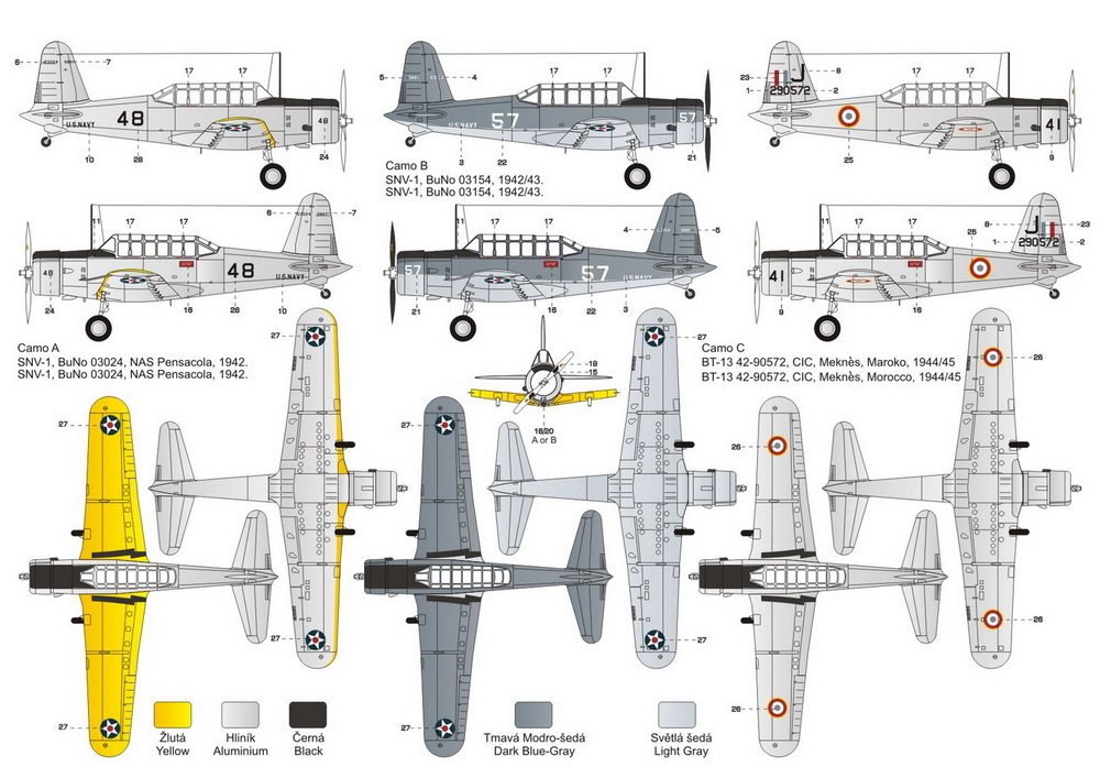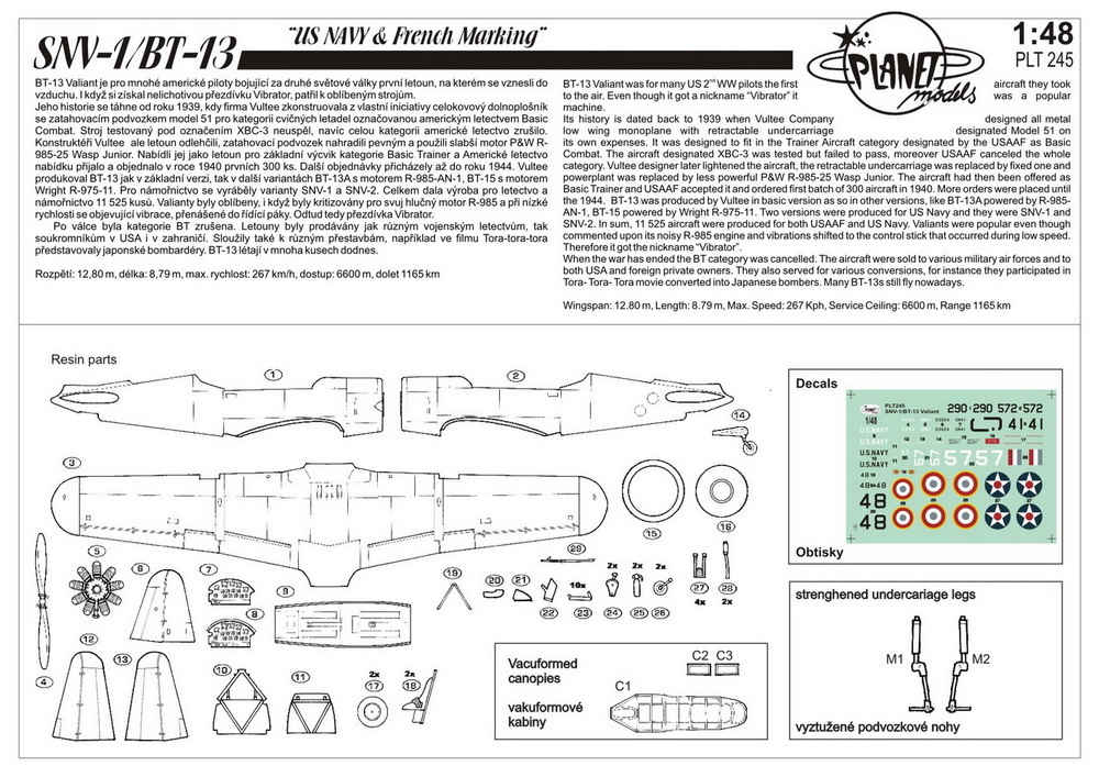 Full resin kit of a US WW II trainer aircraft. Kit contains strengthened undercarriage legs, vacu canopy and decals for US Navy and French machines.
