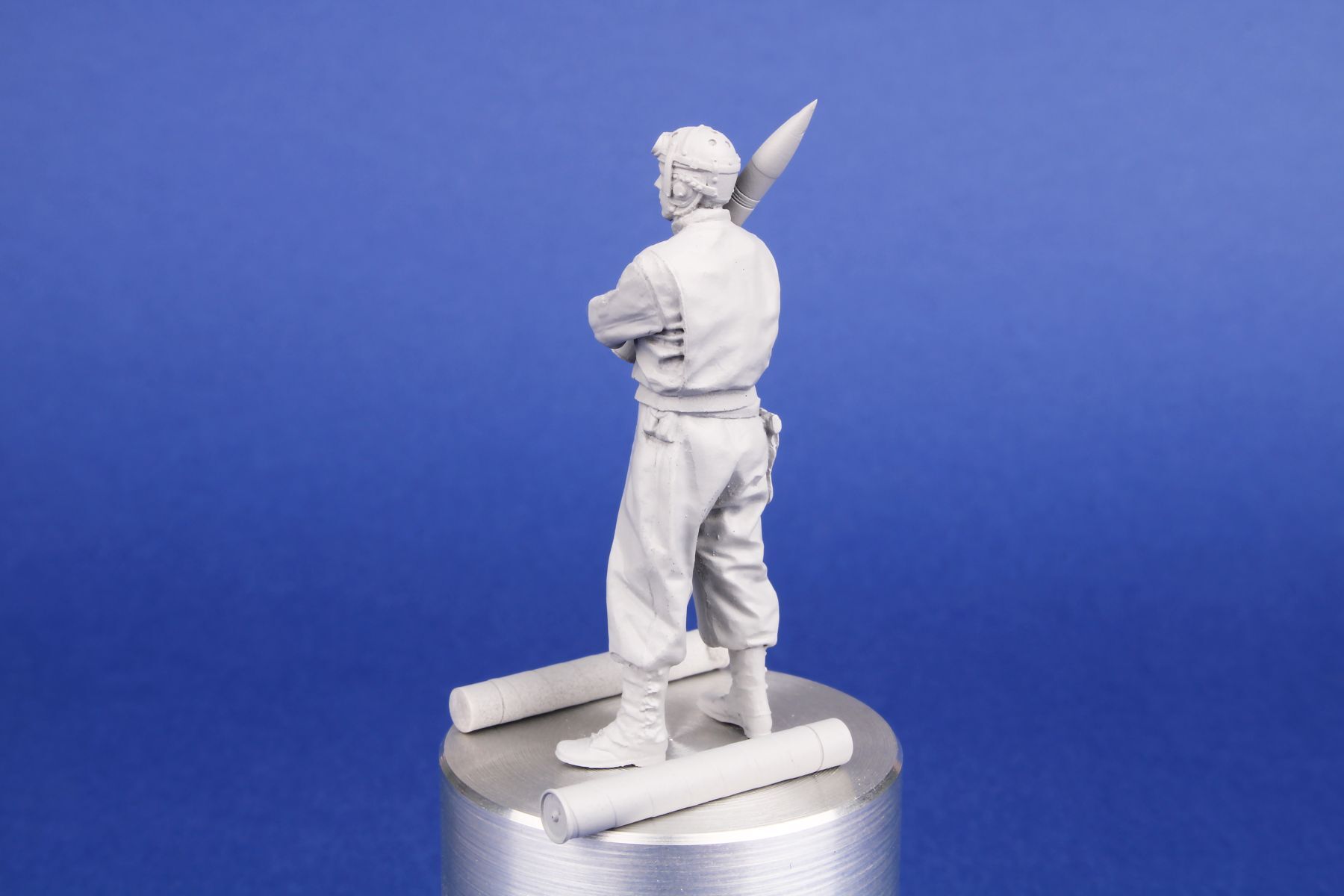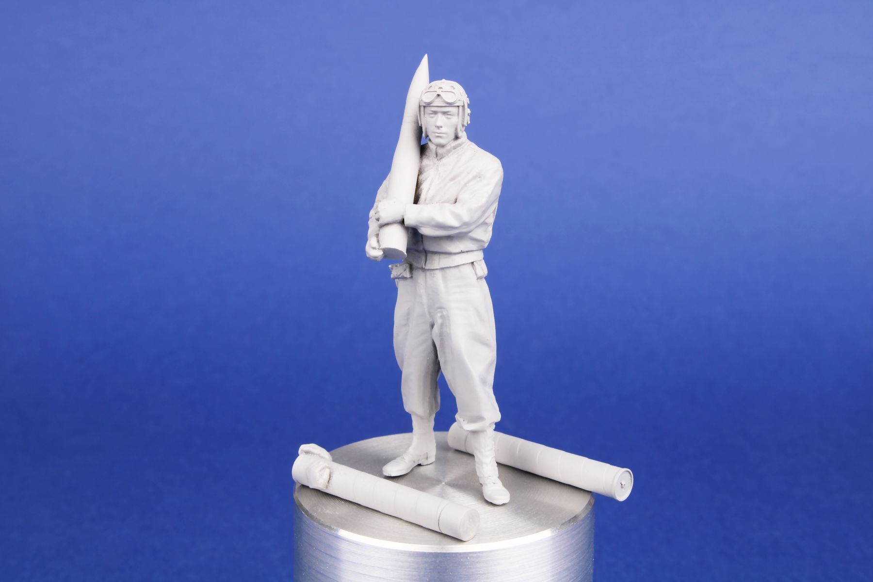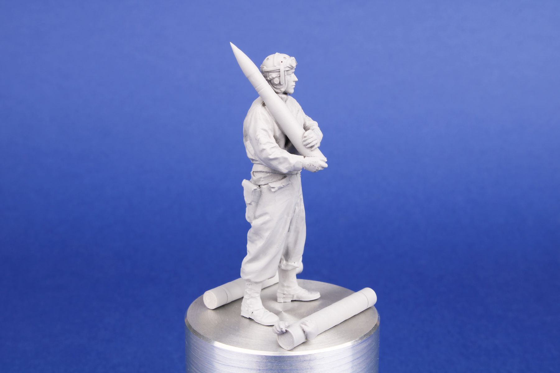 Breathtakingly rendered figure of a tank loader designed for the M36 Jackson Tank Destroyer. The loader, standing upright in a natural pose, holds a 90mm caliber round. The set comes with two types of the shell, the other is placed in a case.
