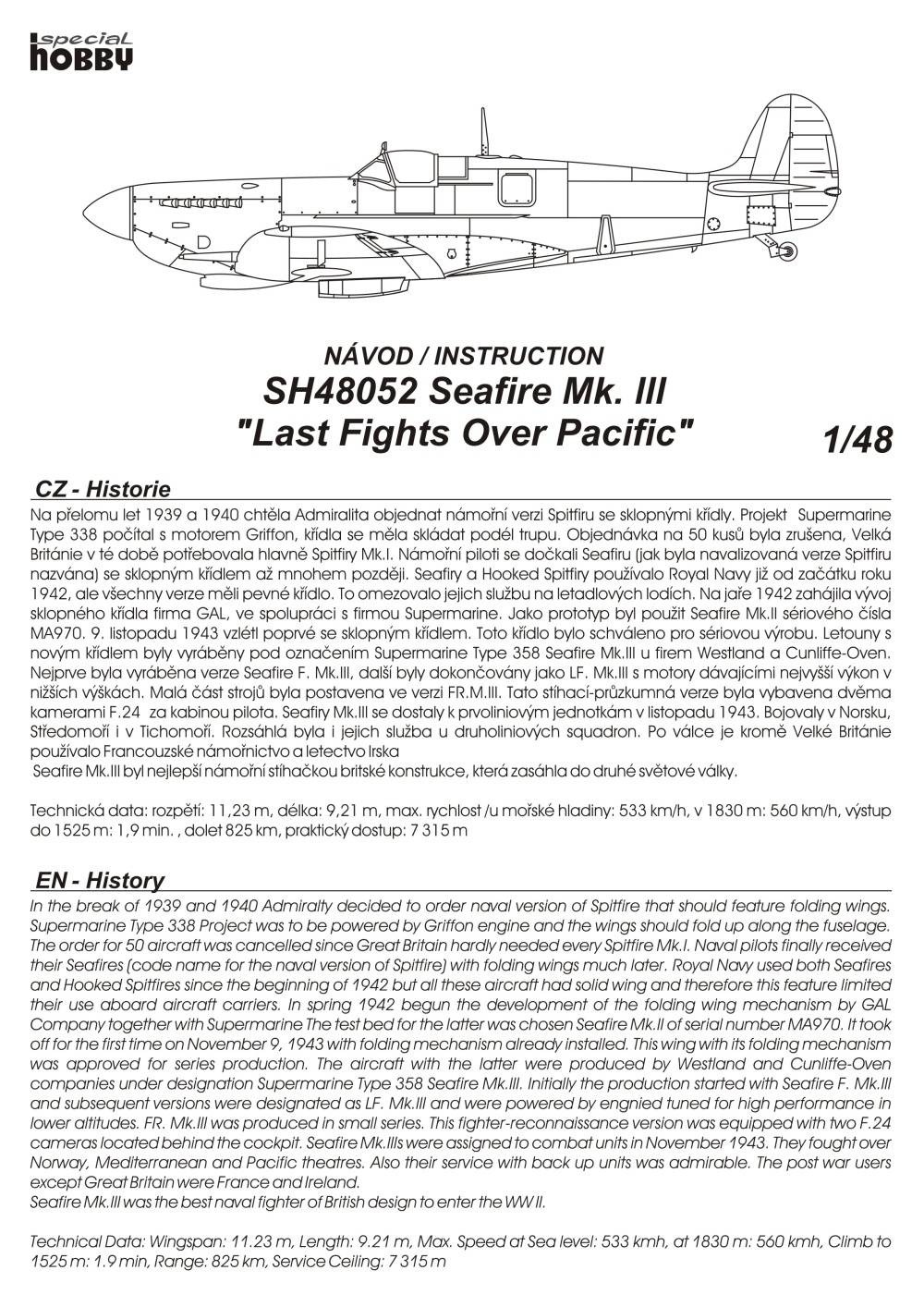 Námořní stíhačka Seafire vznikla během druhé světové války v podstatě nouzovou navalizací Spitfiru Mk.V. Postupně byly s motory R&R Merlin vyráběny verze Mk.I až Mk.III (na ně pak navázaly dalśí verze s motory R&R Griffon označené Seafire Mk.15, 17, 45, 46 a 47 – Special Hobby má v nabídce Seafire Mk.15, kat. č. SH48116 a SH48125). Seafire Mk.III byl, na rozdíl od předchozích verzí, vybaven sklápěcím křídlem. Motor R&R Merlin serie 45 s nejvyšším výkonem v malých výškách mu dával výkony, které byly u hladiny moře vyšší než výkony moderního Spitfiru Mk.IX. Seafire Mk.III se stal nejlepší námořní stíhačkou britské konstrukce druhé světové války. Při provozu na letadlových lodích byl sice určitým handicapem křehčí podvozek, ale ve vzduchu to byl nebezpečný protivník. O tom se mohli přesvědčit i japonští piloti v závěru druhé světové války.