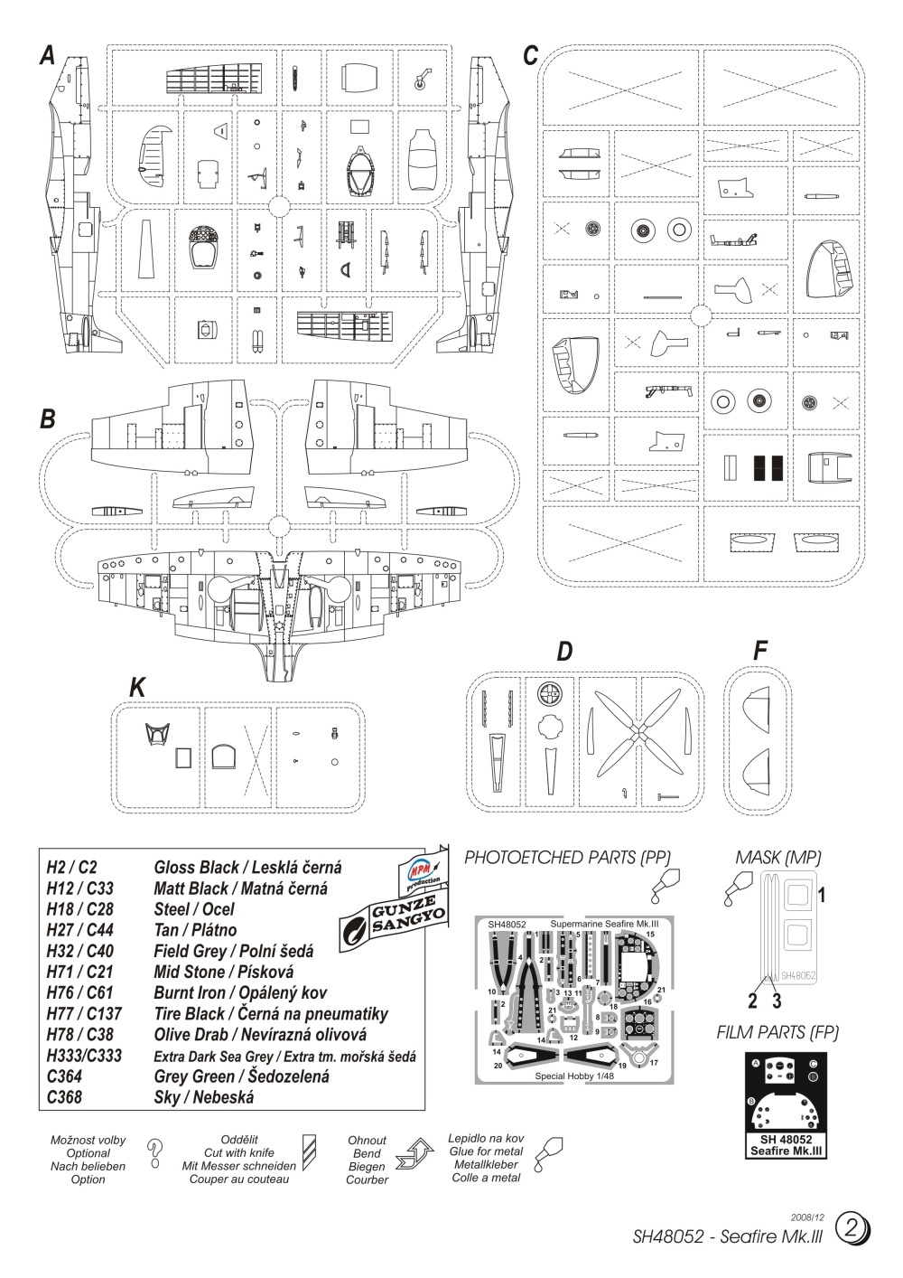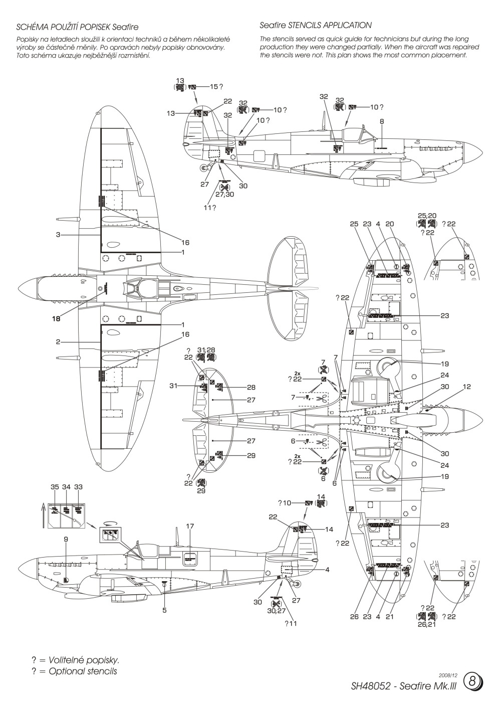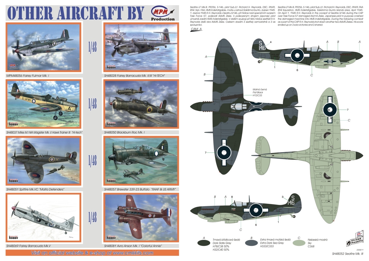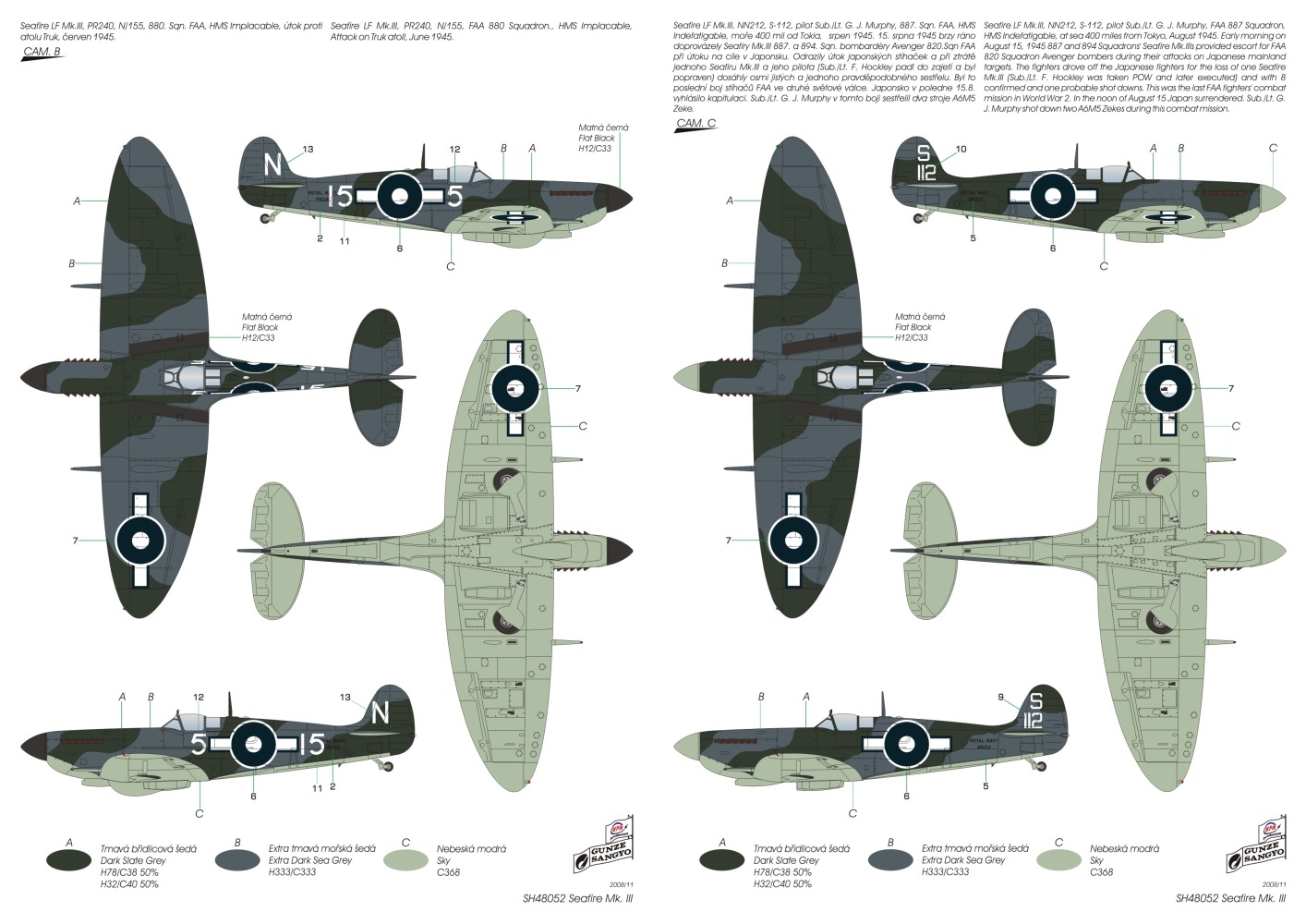 Model SH48052 nabízí tři Seafiry operující na letadlových lodích v Pacifiku. Na jednom z nich létal Sub/Lt R.H. Reynolds, pilot s nejvyšším skore na Seafiru. Další stroj se zúčastnil úplně posledního boje britských námořních stíhačů ve druhé světové válce ráno 15.8.1945. Sub/Lt G.J. Murphy v tomto boji sestřelil dvě Zera. Obsahem krabičky je pět rámečků z šedého plastu, vstřikovaná kabina, lepty a samolepící folie.